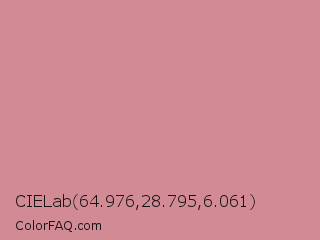 CIELab 64.976,28.795,6.061 Color is a light red color and the nearest color is Puce #cc8899. Hex code #d28a94 and RGB value is rgb(210,138,148). In RGB color space, this color is composed of 82% red, 54% green, 58% blue, In CMYK color space, this color is composed of 0% cyan, 34% magenta, 30% yellow , 18% black , In HSL color space, this color has a hue angle of 352° , 44% saturation and 68% lightness.