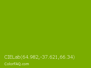 CIELab 64.982,-37.621,66.34 Color is a normal lime color and the nearest color is Limeade #6f9d02. Hex code #7aad00 and RGB value is rgb(122,173,0). In RGB color space, this color is composed of 48% red, 68% green, 0% blue, In CMYK color space, this color is composed of 29% cyan, 0% magenta, 100% yellow , 32% black , In HSL color space, this color has a hue angle of 78° , 100% saturation and 34% lightness.