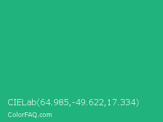CIELab 64.985,-49.622,17.334 Color is a normal green color and the nearest color is Green Crayola #1cac78. Hex code #20b37d and RGB value is rgb(32,179,125). In RGB color space, this color is composed of 13% red, 70% green, 49% blue, In CMYK color space, this color is composed of 82% cyan, 0% magenta, 30% yellow , 30% black , In HSL color space, this color has a hue angle of 158° , 70% saturation and 41% lightness.