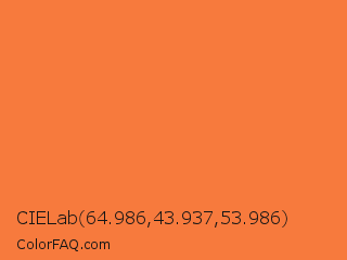 CIELab 64.986,43.937,53.986 Color is a normal orange color and the nearest color is Orange Crayola #ff7538. Hex code #f77a3d and RGB value is rgb(247,122,61). In RGB color space, this color is composed of 97% red, 48% green, 24% blue, In CMYK color space, this color is composed of 0% cyan, 51% magenta, 75% yellow , 3% black , In HSL color space, this color has a hue angle of 20° , 92% saturation and 60% lightness.