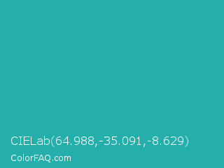 CIELab 64.988,-35.091,-8.629 Color is a normal cyan color and the nearest color is Light Sea Green #20b2aa. Hex code #25afac and RGB value is rgb(37,175,172). In RGB color space, this color is composed of 15% red, 69% green, 67% blue, In CMYK color space, this color is composed of 79% cyan, 0% magenta, 2% yellow , 31% black , In HSL color space, this color has a hue angle of 179° , 65% saturation and 42% lightness.