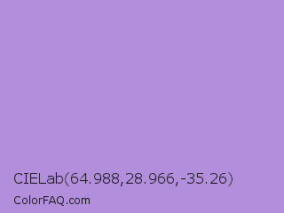 CIELab 64.988,28.966,-35.26 Color is a light violet color and the nearest color is Light Pastel Purple #b19cd9. Hex code #b28edd and RGB value is rgb(178,142,221). In RGB color space, this color is composed of 70% red, 56% green, 87% blue, In CMYK color space, this color is composed of 19% cyan, 36% magenta, 0% yellow , 13% black , In HSL color space, this color has a hue angle of 267° , 54% saturation and 71% lightness.