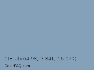CIELab 64.98,-3.841,-16.079 Color is a light blue color and the nearest color is Pewter Blue #8ba8b7. Hex code #85a1ba and RGB value is rgb(133,161,186). In RGB color space, this color is composed of 52% red, 63% green, 73% blue, In CMYK color space, this color is composed of 28% cyan, 13% magenta, 0% yellow , 27% black , In HSL color space, this color has a hue angle of 208° , 28% saturation and 63% lightness.