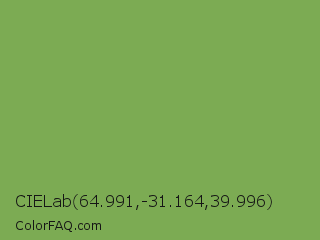 CIELab 64.991,-31.164,39.996 Color is a normal green color and the nearest color is Chelsea Cucumber #83aa5d. Hex code #7cab53 and RGB value is rgb(124,171,83). In RGB color space, this color is composed of 49% red, 67% green, 33% blue, In CMYK color space, this color is composed of 27% cyan, 0% magenta, 51% yellow , 33% black , In HSL color space, this color has a hue angle of 92° , 35% saturation and 50% lightness.