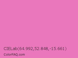 CIELab 64.992,52.848,-15.661 Color is a light magenta color and the nearest color is Persian Pink #f77fbe. Hex code #ea76bb and RGB value is rgb(234,118,187). In RGB color space, this color is composed of 92% red, 46% green, 73% blue, In CMYK color space, this color is composed of 0% cyan, 50% magenta, 20% yellow , 8% black , In HSL color space, this color has a hue angle of 324° , 73% saturation and 69% lightness.
