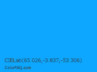 CIELab 65.026,-3.837,-53.306 Color is a normal blue color and the nearest color is Vivid Cerulean #00aaee. Hex code #0ca5fd and RGB value is rgb(12,165,253). In RGB color space, this color is composed of 5% red, 65% green, 99% blue, In CMYK color space, this color is composed of 95% cyan, 35% magenta, 0% yellow , 1% black , In HSL color space, this color has a hue angle of 202° , 98% saturation and 52% lightness.