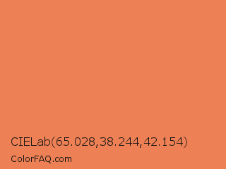 CIELab 65.028,38.244,42.154 Color is a light orange color and the nearest color is Burnt Sienna #e97451. Hex code #ed8054 and RGB value is rgb(237,128,84). In RGB color space, this color is composed of 93% red, 50% green, 33% blue, In CMYK color space, this color is composed of 0% cyan, 46% magenta, 65% yellow , 7% black , In HSL color space, this color has a hue angle of 17° , 81% saturation and 63% lightness.