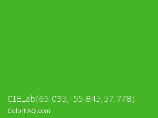 CIELab 65.035,-55.845,57.778 Color is a normal green color and the nearest color is Kelly Green #4cbb17. Hex code #46b427 and RGB value is rgb(70,180,39). In RGB color space, this color is composed of 27% red, 71% green, 15% blue, In CMYK color space, this color is composed of 61% cyan, 0% magenta, 78% yellow , 29% black , In HSL color space, this color has a hue angle of 107° , 64% saturation and 43% lightness.