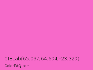 CIELab 65.037,64.694,-23.329 Color is a light magenta color and the nearest color is Rose Pink #ff66cc. Hex code #f769c9 and RGB value is rgb(247,105,201). In RGB color space, this color is composed of 97% red, 41% green, 79% blue, In CMYK color space, this color is composed of 0% cyan, 57% magenta, 19% yellow , 3% black , In HSL color space, this color has a hue angle of 319° , 90% saturation and 69% lightness.