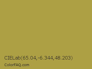 CIELab 65.04,-6.344,48.203 Color is a normal yellow color and the nearest color is Brass #b5a642. Hex code #ad9f44 and RGB value is rgb(173,159,68). In RGB color space, this color is composed of 68% red, 62% green, 27% blue, In CMYK color space, this color is composed of 0% cyan, 8% magenta, 61% yellow , 32% black , In HSL color space, this color has a hue angle of 52° , 44% saturation and 47% lightness.