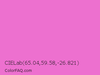 CIELab 65.04,59.58,-26.821 Color is a light magenta color and the nearest color is Orchid #da70d6. Hex code #ed70cf and RGB value is rgb(237,112,207). In RGB color space, this color is composed of 93% red, 44% green, 81% blue, In CMYK color space, this color is composed of 0% cyan, 53% magenta, 13% yellow , 7% black , In HSL color space, this color has a hue angle of 314° , 78% saturation and 68% lightness.
