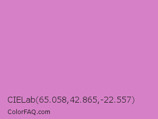 CIELab 65.058,42.865,-22.557 Color is a light magenta color and the nearest color is Middle Purple #d982b5. Hex code #d681c7 and RGB value is rgb(214,129,199). In RGB color space, this color is composed of 84% red, 51% green, 78% blue, In CMYK color space, this color is composed of 0% cyan, 40% magenta, 7% yellow , 16% black , In HSL color space, this color has a hue angle of 311° , 51% saturation and 67% lightness.