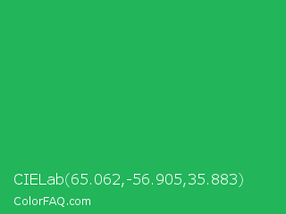 CIELab 65.062,-56.905,35.883 Color is a normal green color and the nearest color is Green Crayola #1cac78. Hex code #22b55a and RGB value is rgb(34,181,90). In RGB color space, this color is composed of 13% red, 71% green, 35% blue, In CMYK color space, this color is composed of 81% cyan, 0% magenta, 50% yellow , 29% black , In HSL color space, this color has a hue angle of 143° , 68% saturation and 42% lightness.