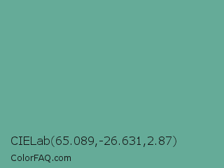CIELab 65.089,-26.631,2.87 Color is a normal cyan color and the nearest color is Polished Pine #5da493. Hex code #65ab98 and RGB value is rgb(101,171,152). In RGB color space, this color is composed of 40% red, 67% green, 60% blue, In CMYK color space, this color is composed of 41% cyan, 0% magenta, 11% yellow , 33% black , In HSL color space, this color has a hue angle of 164° , 29% saturation and 53% lightness.