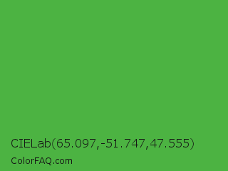 CIELab 65.097,-51.747,47.555 Color is a normal green color and the nearest color is Apple #4fa83d. Hex code #4cb342 and RGB value is rgb(76,179,66). In RGB color space, this color is composed of 30% red, 70% green, 26% blue, In CMYK color space, this color is composed of 58% cyan, 0% magenta, 63% yellow , 30% black , In HSL color space, this color has a hue angle of 115° , 46% saturation and 48% lightness.