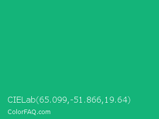 CIELab 65.099,-51.866,19.64 Color is a normal green color and the nearest color is Green Crayola #1cac78. Hex code #14b479 and RGB value is rgb(20,180,121). In RGB color space, this color is composed of 8% red, 71% green, 47% blue, In CMYK color space, this color is composed of 89% cyan, 0% magenta, 33% yellow , 29% black , In HSL color space, this color has a hue angle of 158° , 80% saturation and 39% lightness.
