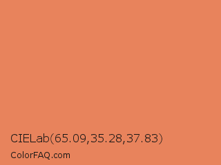 CIELab 65.09,35.28,37.83 Color is a light orange color and the nearest color is Big Foot Feet #e88e5a. Hex code #e8835c and RGB value is rgb(232,131,92). In RGB color space, this color is composed of 91% red, 51% green, 36% blue, In CMYK color space, this color is composed of 0% cyan, 44% magenta, 60% yellow , 9% black , In HSL color space, this color has a hue angle of 17° , 75% saturation and 64% lightness.