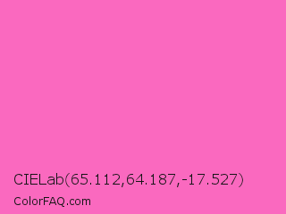 CIELab 65.112,64.187,-17.527 Color is a light magenta color and the nearest color is Hot Pink #ff69b4. Hex code #fa69bf and RGB value is rgb(250,105,191). In RGB color space, this color is composed of 98% red, 41% green, 75% blue, In CMYK color space, this color is composed of 0% cyan, 58% magenta, 24% yellow , 2% black , In HSL color space, this color has a hue angle of 324° , 94% saturation and 70% lightness.