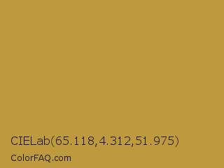 CIELab 65.118,4.312,51.975 Color is a normal orange color and the nearest color is Tussock #c5994b. Hex code #bf993d and RGB value is rgb(191,153,61). In RGB color space, this color is composed of 75% red, 60% green, 24% blue, In CMYK color space, this color is composed of 0% cyan, 20% magenta, 68% yellow , 25% black , In HSL color space, this color has a hue angle of 42° , 52% saturation and 49% lightness.