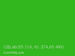 CIELab 65.119,-61.374,60.499 Color is a normal green color and the nearest color is Wageningen Green #34b233. Hex code #31b61d and RGB value is rgb(49,182,29). In RGB color space, this color is composed of 19% red, 71% green, 11% blue, In CMYK color space, this color is composed of 73% cyan, 0% magenta, 84% yellow , 29% black , In HSL color space, this color has a hue angle of 112° , 73% saturation and 41% lightness.