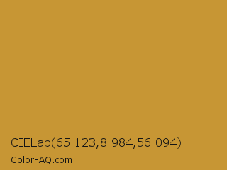 CIELab 65.123,8.984,56.094 Color is a normal orange color and the nearest color is Satin Sheen Gold #cba135. Hex code #c79634 and RGB value is rgb(199,150,52). In RGB color space, this color is composed of 78% red, 59% green, 20% blue, In CMYK color space, this color is composed of 0% cyan, 25% magenta, 74% yellow , 22% black , In HSL color space, this color has a hue angle of 40° , 59% saturation and 49% lightness.