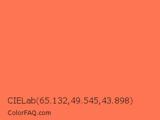 CIELab 65.132,49.545,43.898 Color is a light red color and the nearest color is Persimmon #ff6b53. Hex code #fd7552 and RGB value is rgb(253,117,82). In RGB color space, this color is composed of 99% red, 46% green, 32% blue, In CMYK color space, this color is composed of 0% cyan, 54% magenta, 68% yellow , 1% black , In HSL color space, this color has a hue angle of 12° , 98% saturation and 66% lightness.