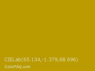 CIELab 65.134,-1.379,68.696 Color is a normal yellow color and the nearest color is Buddha Gold #c1a004. Hex code #ba9c00 and RGB value is rgb(186,156,0). In RGB color space, this color is composed of 73% red, 61% green, 0% blue, In CMYK color space, this color is composed of 0% cyan, 16% magenta, 100% yellow , 27% black , In HSL color space, this color has a hue angle of 50° , 100% saturation and 36% lightness.