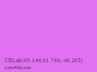 CIELab 65.144,61.744,-46.265 Color is a light magenta color and the nearest color is Heliotrope #df73ff. Hex code #e171f2 and RGB value is rgb(225,113,242). In RGB color space, this color is composed of 88% red, 44% green, 95% blue, In CMYK color space, this color is composed of 7% cyan, 53% magenta, 0% yellow , 5% black , In HSL color space, this color has a hue angle of 292° , 83% saturation and 70% lightness.