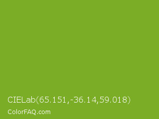 CIELab 65.151,-36.14,59.018 Color is a normal green color and the nearest color is Lima #76bd17. Hex code #7bad26 and RGB value is rgb(123,173,38). In RGB color space, this color is composed of 48% red, 68% green, 15% blue, In CMYK color space, this color is composed of 29% cyan, 0% magenta, 78% yellow , 32% black , In HSL color space, this color has a hue angle of 82° , 64% saturation and 41% lightness.