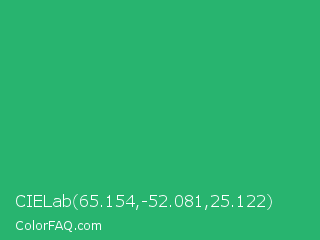 CIELab 65.154,-52.081,25.122 Color is a normal green color and the nearest color is Green Crayola #1cac78. Hex code #28b46f and RGB value is rgb(40,180,111). In RGB color space, this color is composed of 16% red, 71% green, 44% blue, In CMYK color space, this color is composed of 78% cyan, 0% magenta, 38% yellow , 29% black , In HSL color space, this color has a hue angle of 150° , 64% saturation and 43% lightness.