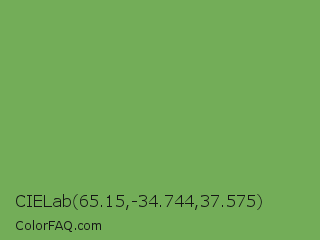 CIELab 65.15,-34.744,37.575 Color is a normal green color and the nearest color is Bud Green #7bb661. Hex code #73ad58 and RGB value is rgb(115,173,88). In RGB color space, this color is composed of 45% red, 68% green, 35% blue, In CMYK color space, this color is composed of 34% cyan, 0% magenta, 49% yellow , 32% black , In HSL color space, this color has a hue angle of 101° , 34% saturation and 51% lightness.