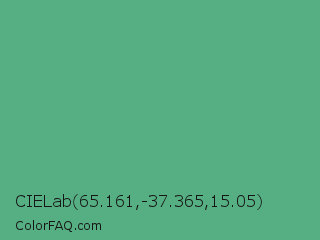 CIELab 65.161,-37.365,15.05 Color is a normal green color and the nearest color is Shiny Shamrock #5fa778. Hex code #56af82 and RGB value is rgb(86,175,130). In RGB color space, this color is composed of 34% red, 69% green, 51% blue, In CMYK color space, this color is composed of 51% cyan, 0% magenta, 26% yellow , 31% black , In HSL color space, this color has a hue angle of 150° , 36% saturation and 51% lightness.