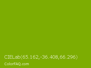 CIELab 65.162,-36.408,66.296 Color is a normal lime color and the nearest color is Apple Green #8db600. Hex code #7dad02 and RGB value is rgb(125,173,2). In RGB color space, this color is composed of 49% red, 68% green, 1% blue, In CMYK color space, this color is composed of 28% cyan, 0% magenta, 99% yellow , 32% black , In HSL color space, this color has a hue angle of 77° , 98% saturation and 34% lightness.