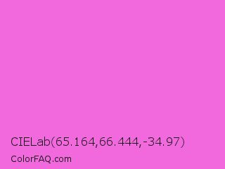 CIELab 65.164,66.444,-34.97 Color is a light magenta color and the nearest color is Rose Pink #ff66cc. Hex code #f269de and RGB value is rgb(242,105,222). In RGB color space, this color is composed of 95% red, 41% green, 87% blue, In CMYK color space, this color is composed of 0% cyan, 57% magenta, 8% yellow , 5% black , In HSL color space, this color has a hue angle of 309° , 84% saturation and 68% lightness.
