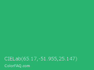 CIELab 65.17,-51.955,25.147 Color is a normal green color and the nearest color is Green Crayola #1cac78. Hex code #29b46f and RGB value is rgb(41,180,111). In RGB color space, this color is composed of 16% red, 71% green, 44% blue, In CMYK color space, this color is composed of 77% cyan, 0% magenta, 38% yellow , 29% black , In HSL color space, this color has a hue angle of 150° , 63% saturation and 43% lightness.