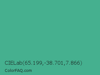 CIELab 65.199,-38.701,7.866 Color is a normal green color and the nearest color is Mint #3eb489. Hex code #45b08f and RGB value is rgb(69,176,143). In RGB color space, this color is composed of 27% red, 69% green, 56% blue, In CMYK color space, this color is composed of 61% cyan, 0% magenta, 19% yellow , 31% black , In HSL color space, this color has a hue angle of 161° , 44% saturation and 48% lightness.