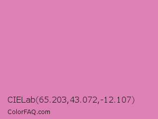 CIELab 65.203,43.072,-12.107 Color is a light magenta color and the nearest color is Middle Purple #d982b5. Hex code #de80b5 and RGB value is rgb(222,128,181). In RGB color space, this color is composed of 87% red, 50% green, 71% blue, In CMYK color space, this color is composed of 0% cyan, 42% magenta, 18% yellow , 13% black , In HSL color space, this color has a hue angle of 326° , 59% saturation and 69% lightness.