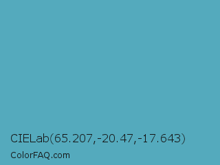 CIELab 65.207,-20.47,-17.643 Color is a normal cyan color and the nearest color is Fountain Blue #56b4be. Hex code #54aabd and RGB value is rgb(84,170,189). In RGB color space, this color is composed of 33% red, 67% green, 74% blue, In CMYK color space, this color is composed of 56% cyan, 10% magenta, 0% yellow , 26% black , In HSL color space, this color has a hue angle of 191° , 44% saturation and 54% lightness.