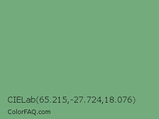CIELab 65.215,-27.724,18.076 Color is a normal green color and the nearest color is Amulet #7b9f80. Hex code #74ab7d and RGB value is rgb(116,171,125). In RGB color space, this color is composed of 45% red, 67% green, 49% blue, In CMYK color space, this color is composed of 32% cyan, 0% magenta, 27% yellow , 33% black , In HSL color space, this color has a hue angle of 130° , 25% saturation and 56% lightness.