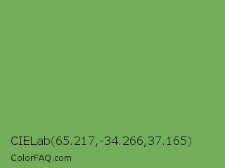 CIELab 65.217,-34.266,37.165 Color is a normal green color and the nearest color is Bud Green #7bb661. Hex code #74ad59 and RGB value is rgb(116,173,89). In RGB color space, this color is composed of 45% red, 68% green, 35% blue, In CMYK color space, this color is composed of 33% cyan, 0% magenta, 49% yellow , 32% black , In HSL color space, this color has a hue angle of 101° , 34% saturation and 51% lightness.