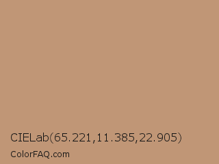 CIELab 65.221,11.385,22.905 Color is a light orange color and the nearest color is Pale Taupe #bc987e. Hex code #c09676 and RGB value is rgb(192,150,118). In RGB color space, this color is composed of 75% red, 59% green, 46% blue, In CMYK color space, this color is composed of 0% cyan, 22% magenta, 39% yellow , 25% black , In HSL color space, this color has a hue angle of 26° , 37% saturation and 61% lightness.
