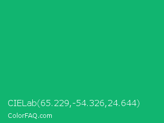 CIELab 65.229,-54.326,24.644 Color is a normal green color and the nearest color is Green Crayola #1cac78. Hex code #11b570 and RGB value is rgb(17,181,112). In RGB color space, this color is composed of 7% red, 71% green, 44% blue, In CMYK color space, this color is composed of 91% cyan, 0% magenta, 38% yellow , 29% black , In HSL color space, this color has a hue angle of 155° , 83% saturation and 39% lightness.