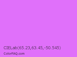 CIELab 65.23,63.45,-50.545 Color is a light purple color and the nearest color is Heliotrope #df73ff. Hex code #e070fa and RGB value is rgb(224,112,250). In RGB color space, this color is composed of 88% red, 44% green, 98% blue, In CMYK color space, this color is composed of 10% cyan, 55% magenta, 0% yellow , 2% black , In HSL color space, this color has a hue angle of 289° , 93% saturation and 71% lightness.