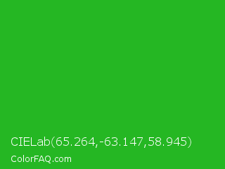 CIELab 65.264,-63.147,58.945 Color is a normal green color and the nearest color is Wageningen Green #34b233. Hex code #25b723 and RGB value is rgb(37,183,35). In RGB color space, this color is composed of 15% red, 72% green, 14% blue, In CMYK color space, this color is composed of 80% cyan, 0% magenta, 81% yellow , 28% black , In HSL color space, this color has a hue angle of 119° , 68% saturation and 43% lightness.