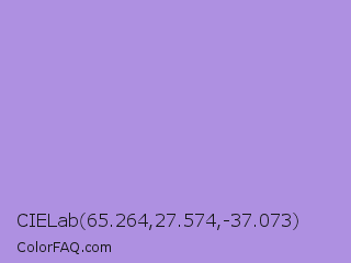 CIELab 65.264,27.574,-37.073 Color is a light violet color and the nearest color is Dull Lavender #a899e6. Hex code #ae90e1 and RGB value is rgb(174,144,225). In RGB color space, this color is composed of 68% red, 56% green, 88% blue, In CMYK color space, this color is composed of 23% cyan, 36% magenta, 0% yellow , 12% black , In HSL color space, this color has a hue angle of 262° , 57% saturation and 72% lightness.