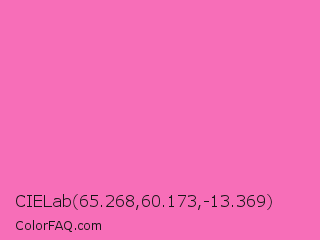 CIELab 65.268,60.173,-13.369 Color is a light rose color and the nearest color is Hot Pink #ff69b4. Hex code #f76eb8 and RGB value is rgb(247,110,184). In RGB color space, this color is composed of 97% red, 43% green, 72% blue, In CMYK color space, this color is composed of 0% cyan, 55% magenta, 26% yellow , 3% black , In HSL color space, this color has a hue angle of 328° , 90% saturation and 70% lightness.