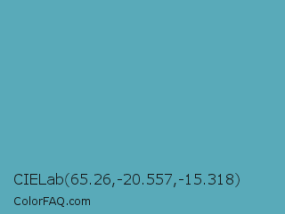 CIELab 65.26,-20.557,-15.318 Color is a normal cyan color and the nearest color is Fountain Blue #56b4be. Hex code #59aab9 and RGB value is rgb(89,170,185). In RGB color space, this color is composed of 35% red, 67% green, 73% blue, In CMYK color space, this color is composed of 52% cyan, 8% magenta, 0% yellow , 27% black , In HSL color space, this color has a hue angle of 189° , 41% saturation and 54% lightness.
