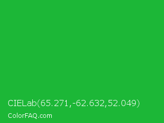 CIELab 65.271,-62.632,52.049 Color is a normal green color and the nearest color is Wageningen Green #34b233. Hex code #1cb737 and RGB value is rgb(28,183,55). In RGB color space, this color is composed of 11% red, 72% green, 22% blue, In CMYK color space, this color is composed of 85% cyan, 0% magenta, 70% yellow , 28% black , In HSL color space, this color has a hue angle of 130° , 73% saturation and 41% lightness.