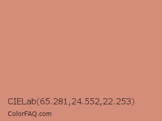 CIELab 65.281,24.552,22.253 Color is a light red color and the nearest color is Burning Sand #d99376. Hex code #d48d78 and RGB value is rgb(212,141,120). In RGB color space, this color is composed of 83% red, 55% green, 47% blue, In CMYK color space, this color is composed of 0% cyan, 33% magenta, 43% yellow , 17% black , In HSL color space, this color has a hue angle of 14° , 52% saturation and 65% lightness.