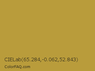 CIELab 65.284,-0.062,52.843 Color is a normal yellow color and the nearest color is Brass #b5a642. Hex code #b99c3b and RGB value is rgb(185,156,59). In RGB color space, this color is composed of 73% red, 61% green, 23% blue, In CMYK color space, this color is composed of 0% cyan, 16% magenta, 68% yellow , 27% black , In HSL color space, this color has a hue angle of 46° , 52% saturation and 48% lightness.